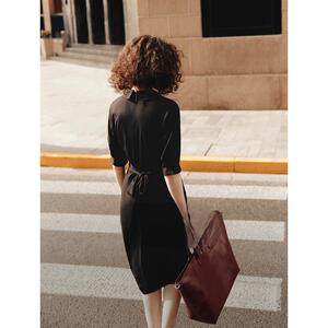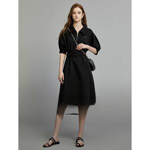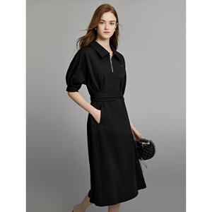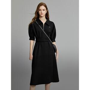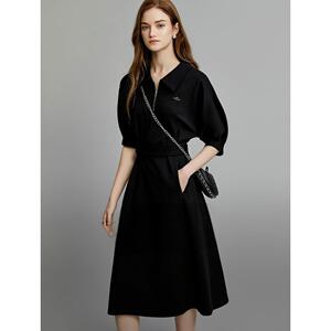 Eシリーズ ブラック ポロ襟デザインワンピース レディース 2025年夏新作 ハイウエスト 細見え 高級感スカート