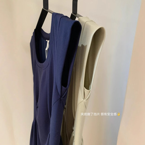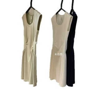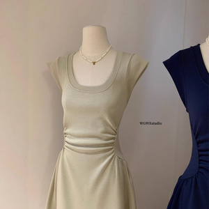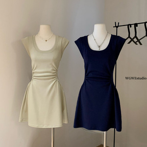 WGWE 夏韓国風シンプルおしゃれカジュアルスリムウエストショートUネックAラインスカートワンピース W6222