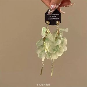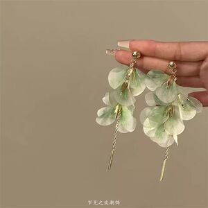 [清風夕暮れ] 早春の緑の花のイヤリング、花びらのタッセルイヤリング、高級リゾートスタイルのイヤークリップイヤリング