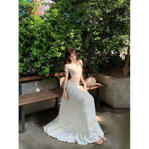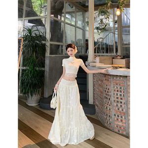 时尚套装蕾丝拼接短袖T恤+长裙女夏季高腰显瘦半身裙大摆裙两件套