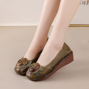 第一層牛革マザーズシューズ、本革ソフトソールシューズ、女性用ウェッジヒール、快適で滑りにくい、レトロエスニックスタイルの中高年革靴