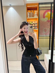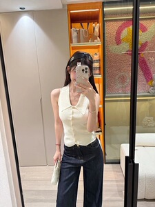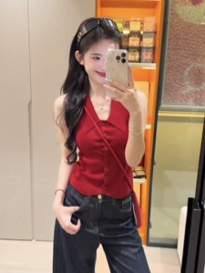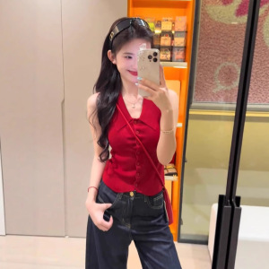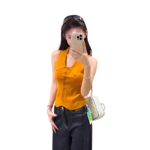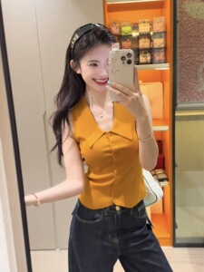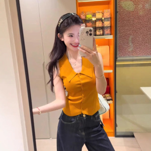レトロオレンジポロカラーノースリーブニット Tシャツ女性の夏スリムフィットショートスタイルラペルベストトップ