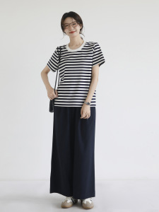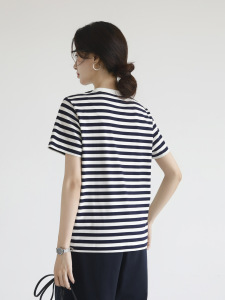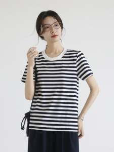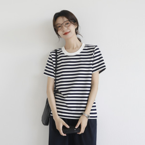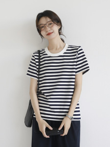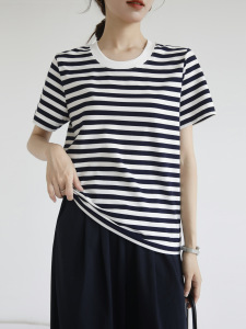 休闲宽松经典条纹圆领t恤女短袖正肩简约通勤浅蓝色叠穿纯棉上衣