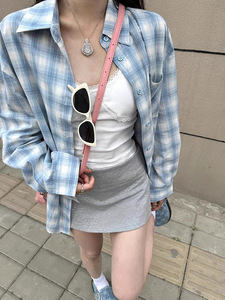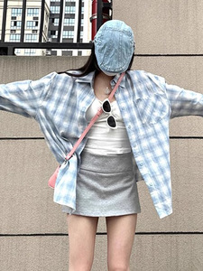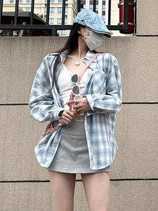 ハイエンドフレンチブルーチェック柄シャツジャケット女性の夏の新作2025シャツユニークな気質長袖トップ