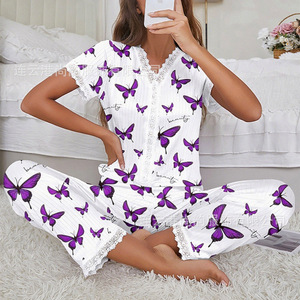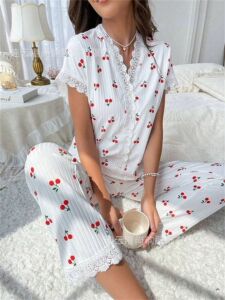 クロスボーダーチェリーハート柄パジャマ レディース 夏新作 上品Vネックゆったり半袖ルームウェア 上下セット