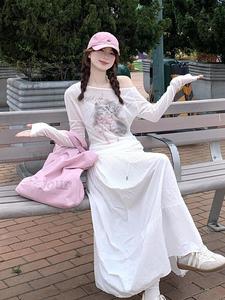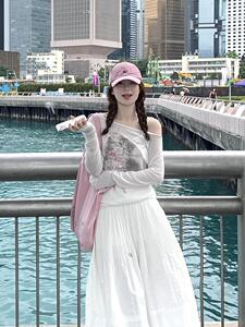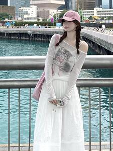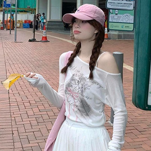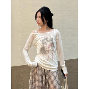 Jiujiu 猫プリントフェイクツーピース日焼け止めブラウス女性の夏ニッチ軽量オフショルダー Tシャツ斜めショルダートップイン