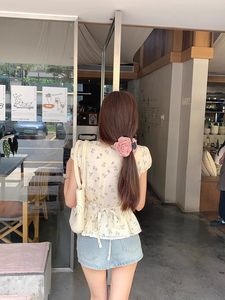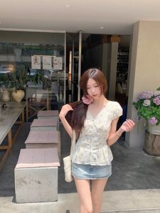 法式蕾丝花边V领短袖碎花衬衫2025夏季新款修身显瘦纯欲上衣女潮