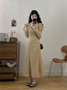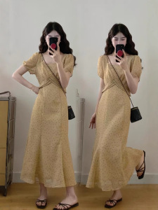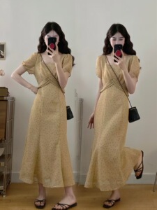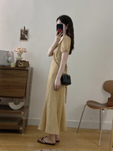 大きいサイズのフレンチポルカドットスクエアネック半袖ドレス女性のための 2025 夏の新しいスタイルの軽い豪華な気質ウエストロングスカート