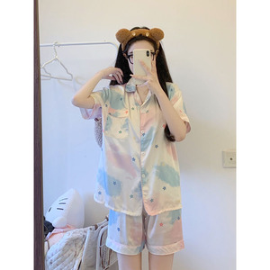 夏クールアイスシルクパジャマ女性のための中国風のかわいい薄いシャツ半袖ショーツホームウェア 2 点セット