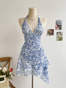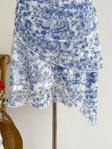 2025年ヨーロッパとアメリカの新しいブルーの花柄ドレス、ファッショナブルでカジュアルで甘いメッシュスリムスカート