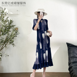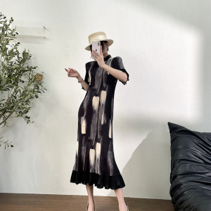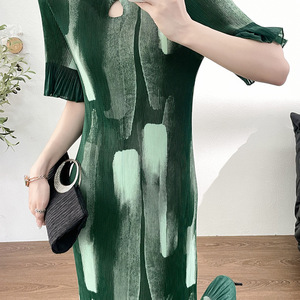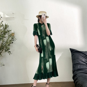 三宅夏季水墨褶皱开叉旗袍长裙女文艺复古优雅高腰显瘦时尚连衣裙