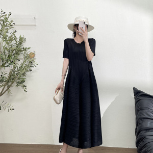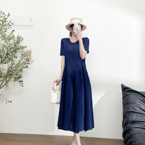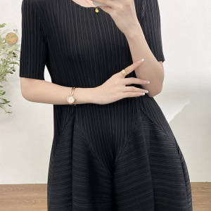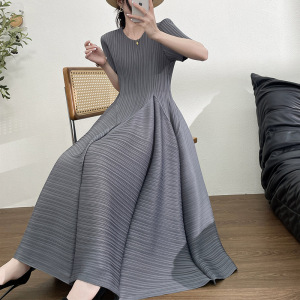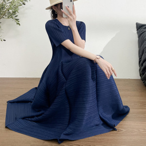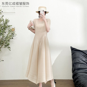 圆领短袖花苞褶皱裙舒适休闲简约连衣裙女收腰气质减龄显瘦长裙