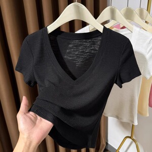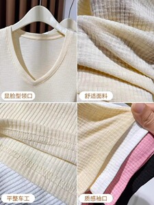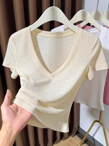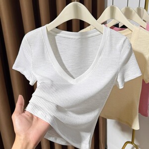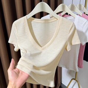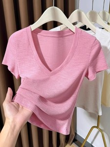 深V领短款坑条T恤女夏2025新款高级感冰丝针织短袖内搭大领口上衣