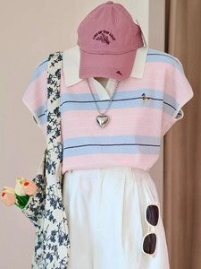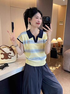 コントラストストライプポロラペル小さなフライングスリーブニット半袖Tシャツ女性用2025夏ドーパミンウェア薄手トップ