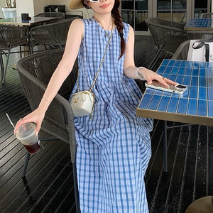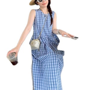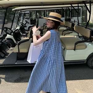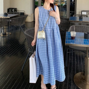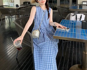「ブルースブルース」ミドル丈ゆったりAラインチェック柄バックレスノースリーブベストワンピース レディース