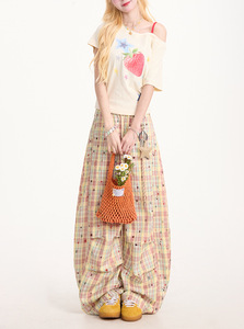 NERESM コントラストカラーチェック柄パンツスターペンダントシミターパンツレディースインカジュアルレイジールーズワイドレッグストレートパンツ