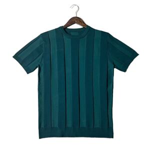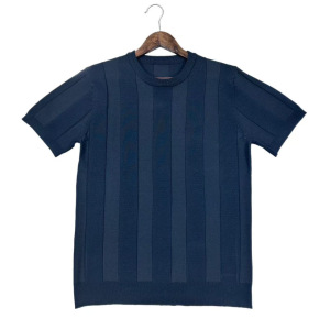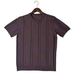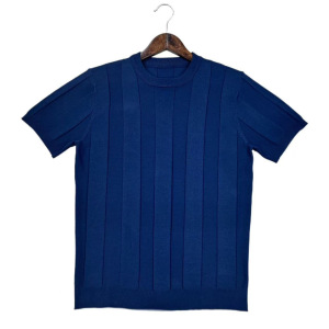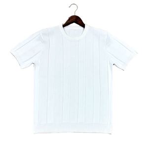 新款夏季男士复古纯色修身圆领竖条纹休闲百搭轻奢短袖针织衫