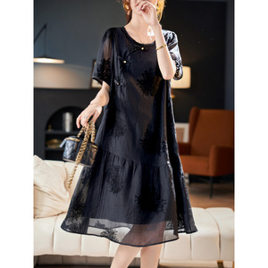 ラウンドネックビーズ刺繍ブラックドレス 2025 夏の気質ファッション半袖ハイエンド A ラインスカートトレンド