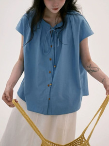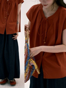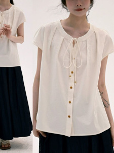 レア RAE ネックラインレースアップスモールフライングスリーブシャツ日本レトロ文学甘い年齢軽減多用途カジュアル半袖