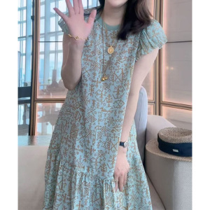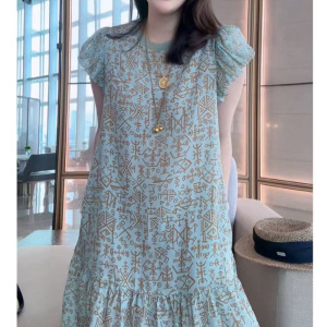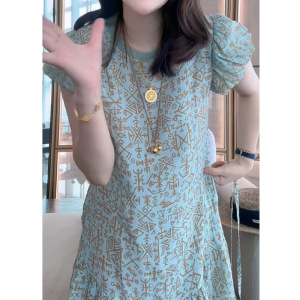 ヨーロッパ製品 2025 新しい夏の模擬シルクラウンドネックシンボルプリント気質マルベリーシルク婦人服ドレス半袖トレンディ