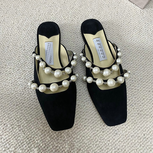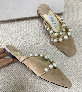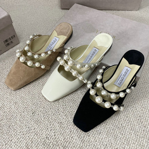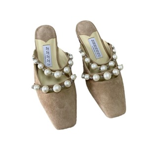 広東省産のトップバージョン!夏新作 JC パールストラップ本革浅いつま先フラットハーフスリッポンミュールレディースシューズ