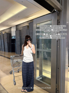 Cookadaily Mermaid_Yuppie リラックス レイジー カジュアル ネイビー チェック柄 ルーズ ワイドレッグ パンツ カジュアル パンツ