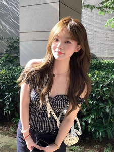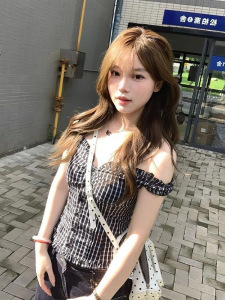 レトロホットガール黒チェック柄ワンショルダーツーウェアシャツレディース夏ウエストショートショートオフショルダートップ
