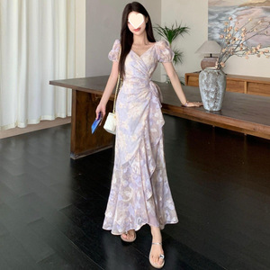 Yujie のユニークで美しい V ネック花柄ドレス女性のための 2025 夏のファッション気質ハイエンドウエストロングスカート