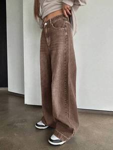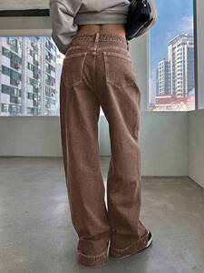女性用ハイウエストストレートブラウンウォッシュジーンズ、レトロルーズアメリカングラデーションブラウンパンツ、バイブワイドレッグパンツ