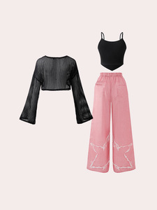 13~16歳の女の子向けの国境を越えた貿易、網タイツ長袖アウタートップ、インナーサスペンダートップ、ファイブスタージーンズ