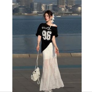 夏の美しい衣装セット 2025 新しい韓国ファッションレースオフショルダー Tシャツフィッシュテールスカート 2 点セット