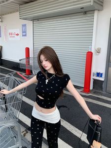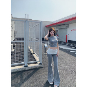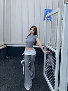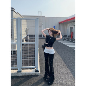 蝴蝶结镂空辣妹短袖T恤女夏季设计感套装撞色微喇叭休闲裤两件套