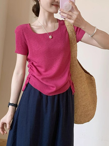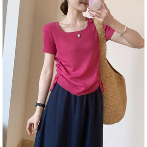 シンプルなスタイルのスクエアカラー両側巾着半袖2025夏新作韓国風カジュアル気質無地Tシャツトップ
