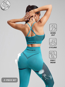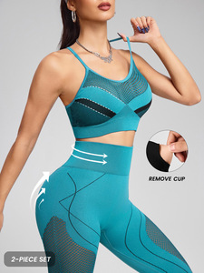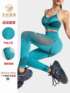 新款无缝瑜伽套装 欧美跨境运动高弹力带胸垫背心网孔长裤套装