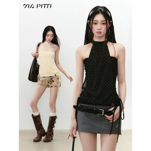 デザインされた胸を包み込むホルターネックのキラキラメッシュスプライシングベストレディースサマースリムフィットレースアップトップ