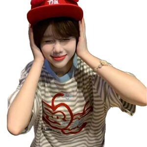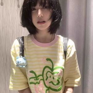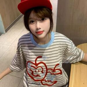 小柄なアップル刺繍キャンパスストライプ半袖Tシャツレディース2025年夏新作ゆったりスリムカジュアルスタイルトップス