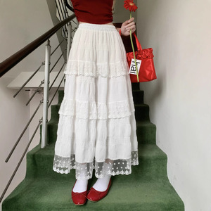 ホワイトデザインレースケーキスカート女性の夏のハイウエストフレンチロングスカート大きな裾スカートAラインスカート