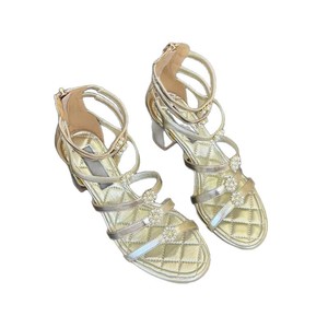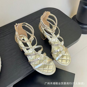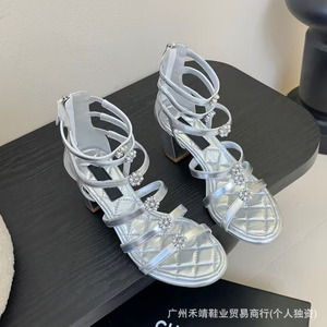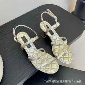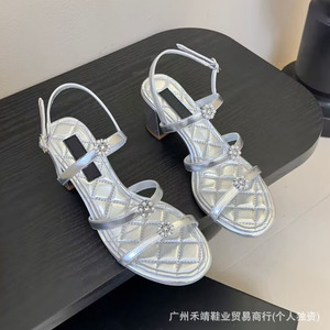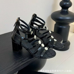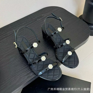 ハイバージョン 2025 新しいスタイルの本革ラウンドトゥフレンチパール厚いヒールワンラインバックルオープントゥハイヒールサンダル女性用