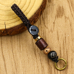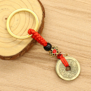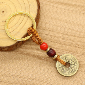 純銅五帝マネーキーホルダーフラットノット祥雲ビーズストラップダイヤモンドノットイエローロープポータブルクリエイティブキーホルダーアクセサリー