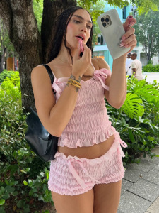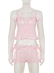 2025夏季新品少女甜美显胸蝶状系带装饰吊带紧身短裤肌理感两件套