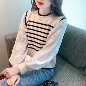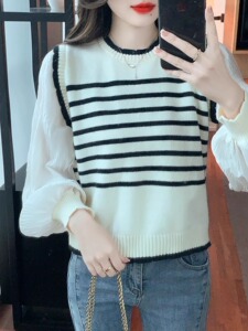 假两件针织打底小衫女装2025年春季新款条纹长袖T恤爆款雪纺上衣