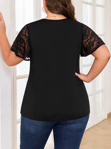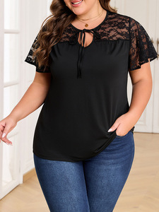 新款跨境外贸亚马逊大码纯色蕾丝拼接圆领绑蝴蝶结荷叶袖上衣T恤