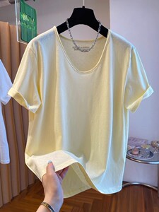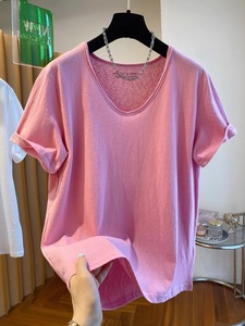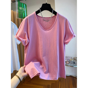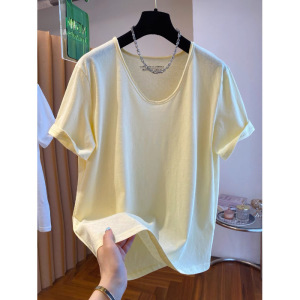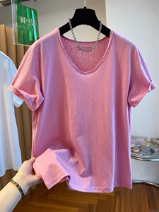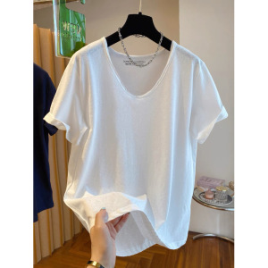 大码240斤纯色u领大领口雪花棉t恤女短袖2025宽松休闲百搭T上衣夏
