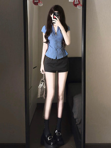 アメリカンカレッジスタイルブルー半袖ショルダーシャツ女性のための夏 2025 ホットガールスリムフィットピンチウエストショートトップス