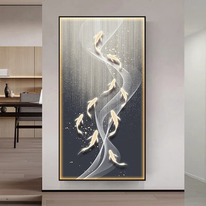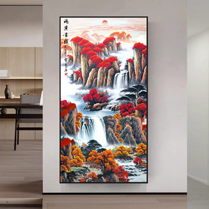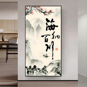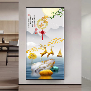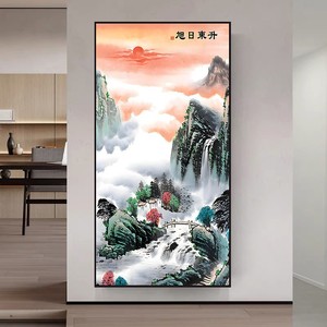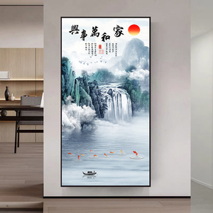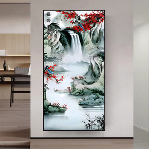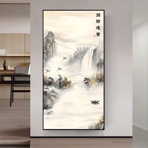 玄关装饰画墙纸贴画新中式入户客厅走廊过道竖版进门山水画自粘壁