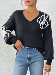 レディーストップスヨーロッパとアメリカの女性の花リボン刺繍不規則な刺繍セーターVネックプルオーバーカジュアルセーター