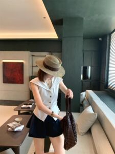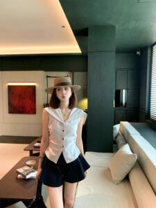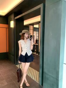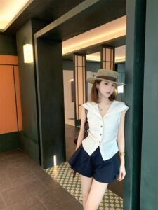 ハイセンスな着こなし、女性用ネイビーカラーベスト、夏の新作ウエスト痩身オールドマネースタイルVネック気質ノースリーブトップ