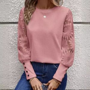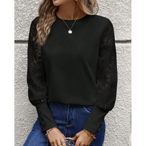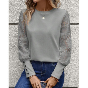 秋のホットスタイルヨーロッパとアメリカの貿易無地長袖刺繍レーススプライシングラウンドネックトップ