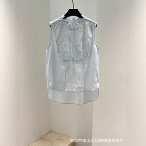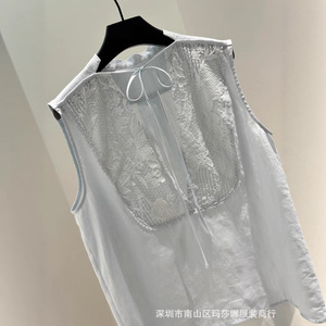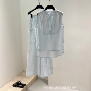 フレンチスタイル25夏の新しいファッション気質エレガントなレースステッチリネンVネックベストトップワイドレッグパンツスーツ女性用