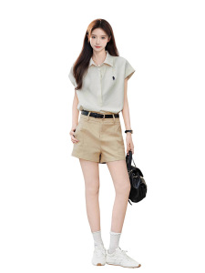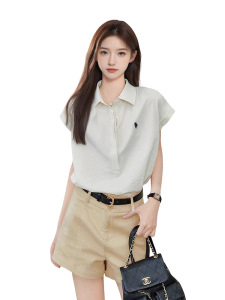 女性のための白いポロカラー半袖シャツ 2025 夏の新しいスタイルの小さなフライングスリーブシャツ小さなシャツデザイン右肩トップ